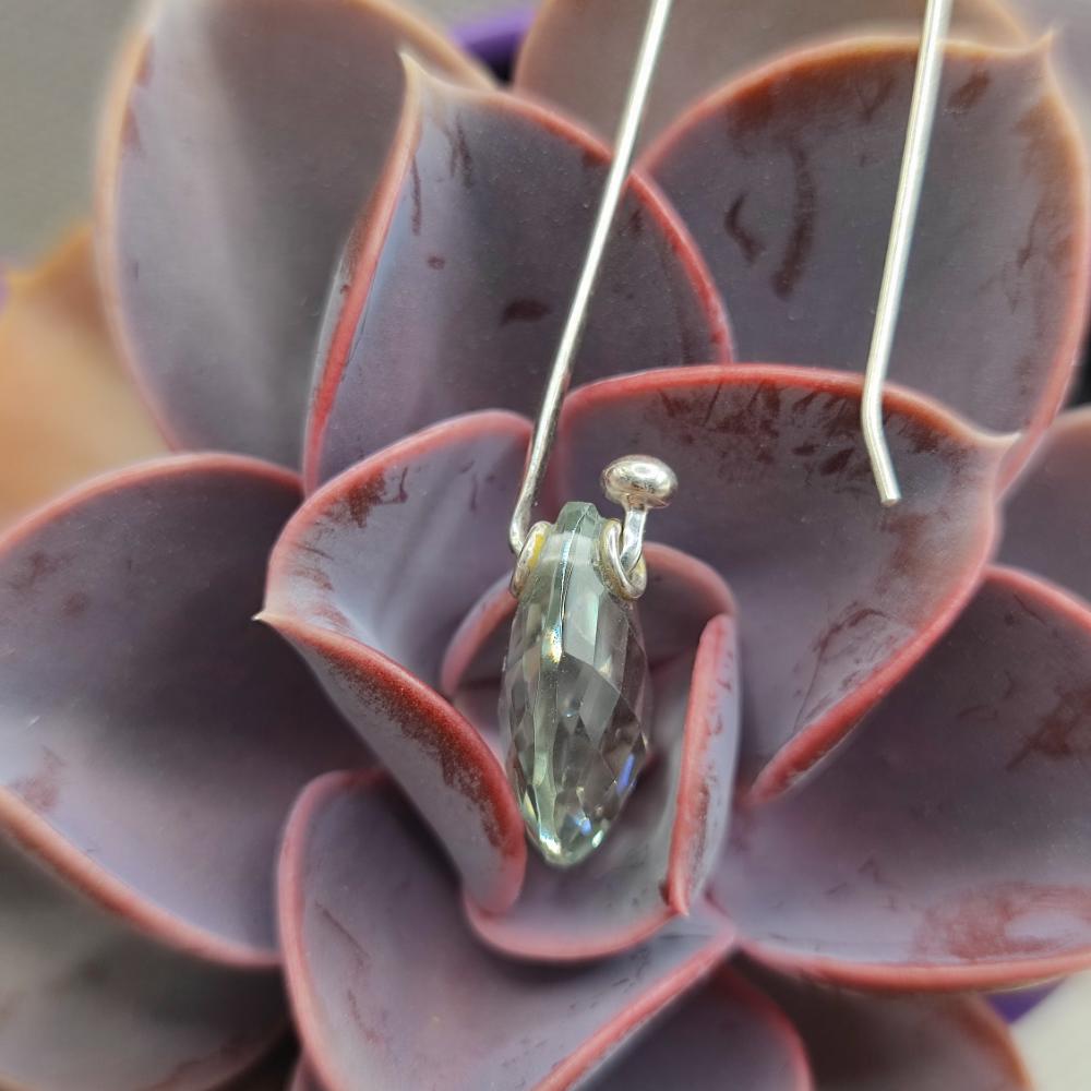 925 silver green amethyst earrings - PALLAVI. Let yourself be captivated by the delicate light of these drop-shaped silver earrings with green amethyst, an elegant and harmonious piece of jewelry, designed for those who love refined details and the discreet charm of natural stones. Their slender silhouette gracefully frames the face, while the stone's facet catches the light and transforms it into small, clear, and precious reflections.