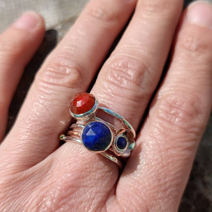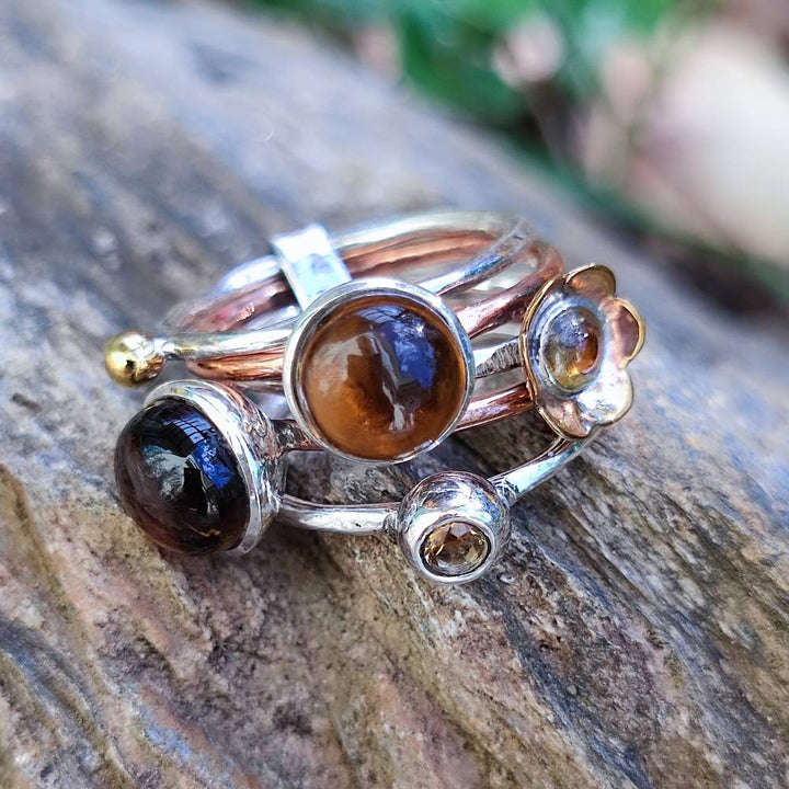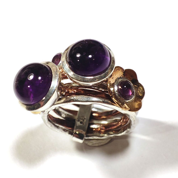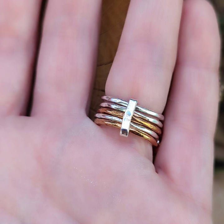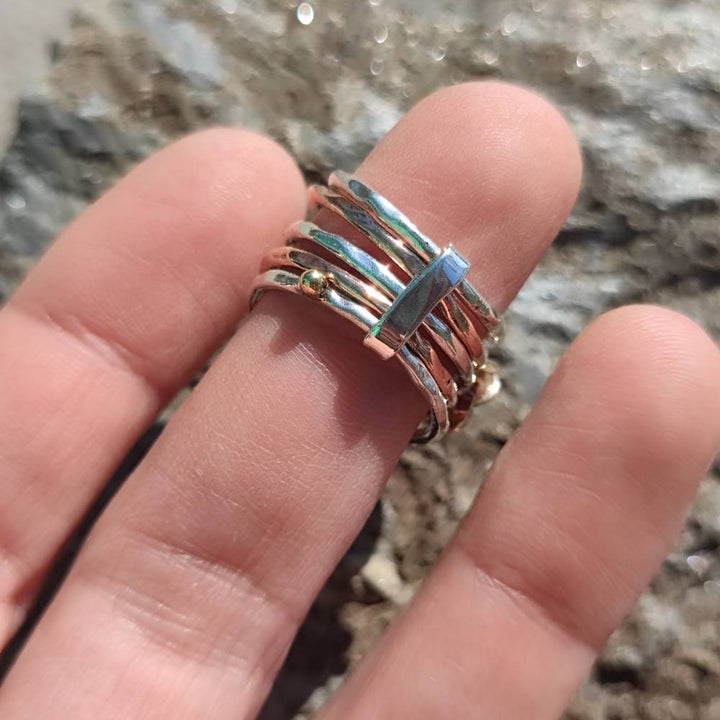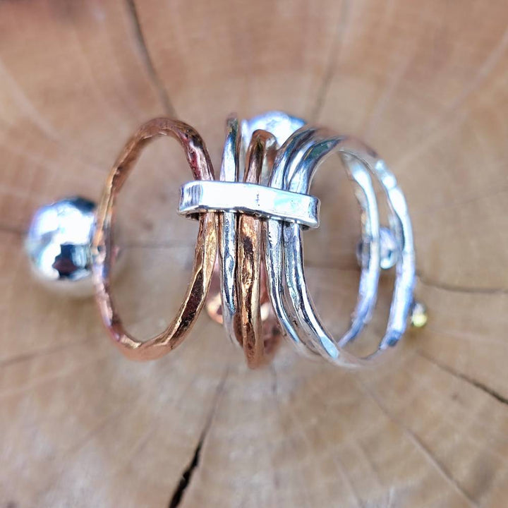 Anello a fascia in argento 925 e rame con pietra - TIRUPATI. Anello multi-pietra realizzato in argento artigianalmente. L'anello è composto infatti da anelli fini martellati che compongono una fascia girevole. Il numero degli anelli e la forma delle pietre varia. Ogni anello ha quindi un motivo diverso in modo da poter cambiare l'aspetto dell'anello in qualsiasi momento. Molte combinazioni possibili per avere diversi anelli in uno.