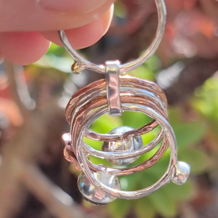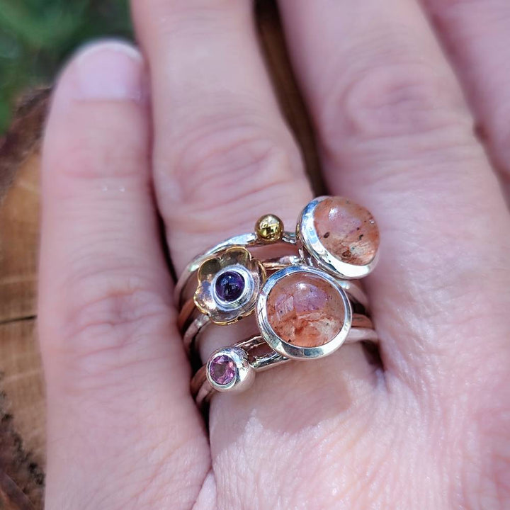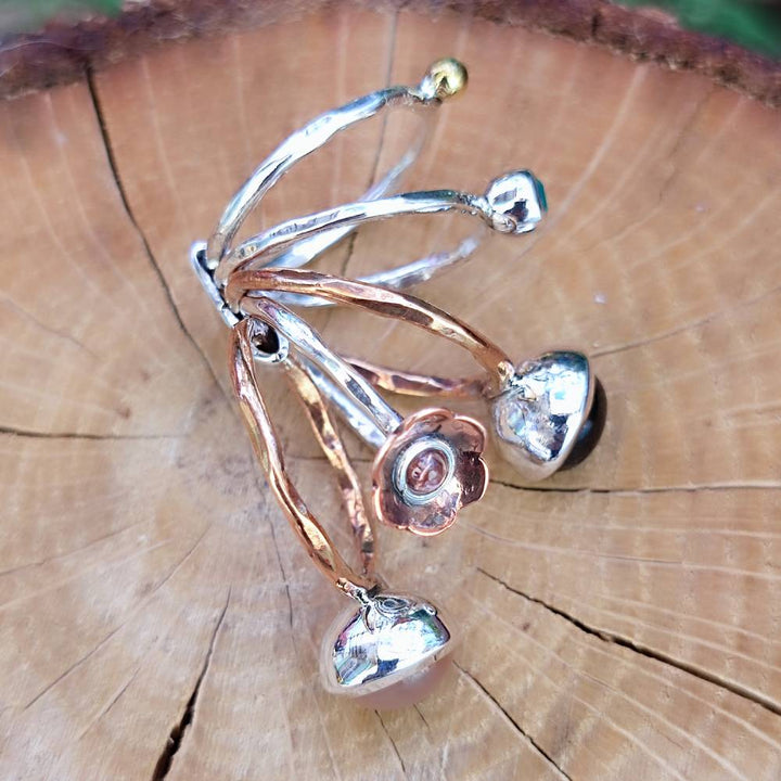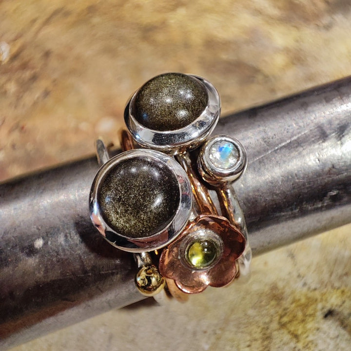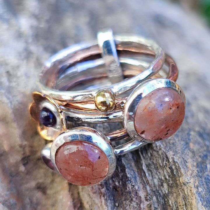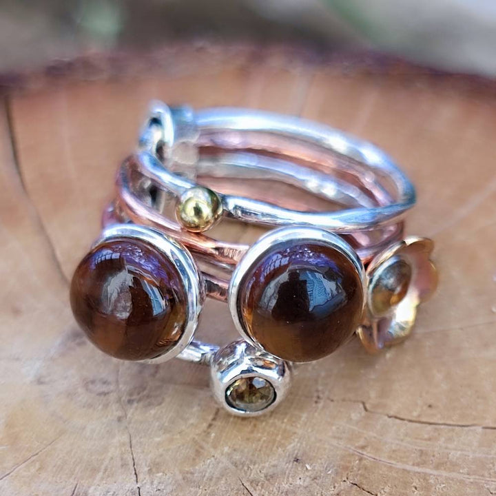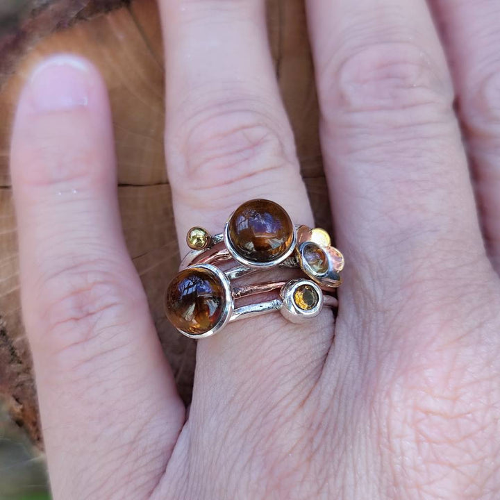 Anello a fascia in argento 925 e rame con pietra - TIRUPATI. Anello multi-pietra realizzato in argento artigianalmente. L'anello è composto infatti da anelli fini martellati che compongono una fascia girevole. Il numero degli anelli e la forma delle pietre varia. Ogni anello ha quindi un motivo diverso in modo da poter cambiare l'aspetto dell'anello in qualsiasi momento. Molte combinazioni possibili per avere diversi anelli in uno.