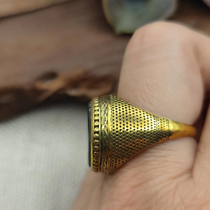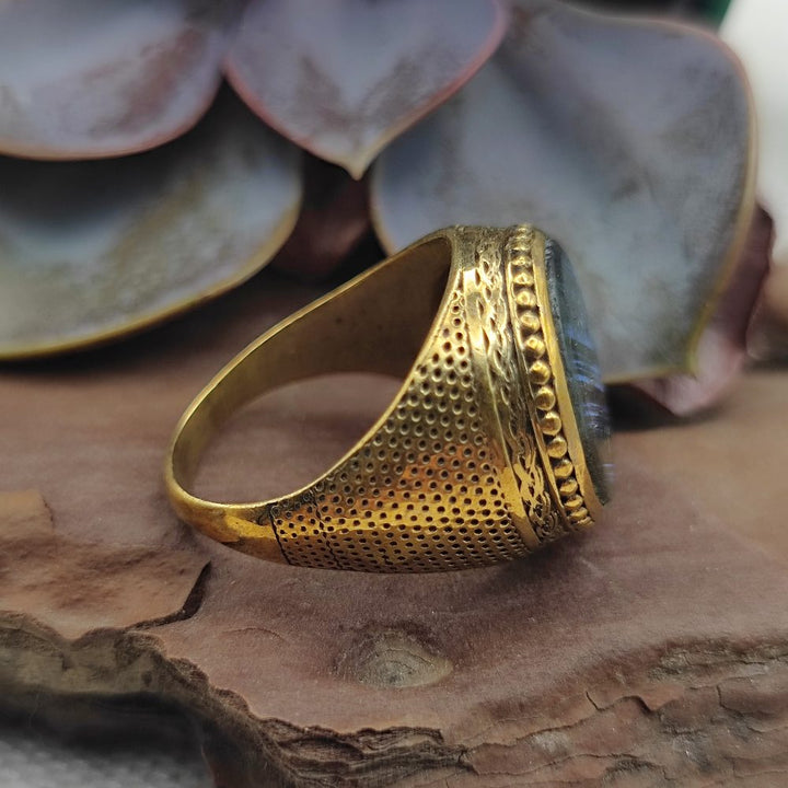 ANELLO etnico a fascia in ottone con pietra - DHENKA. Esprimi la tua personalità con il nostro anello etnico a fascia in ottone, arricchito da una splendida pietra di labradorite naturale. Questo gioiello, realizzato artigianalmente, unisce il fascino del design etnico alla forza mistica della labradorite, conosciuta come “pietra della trasformazione” per le sue sfumature iridescenti e i riflessi che variano dal blu al verde.