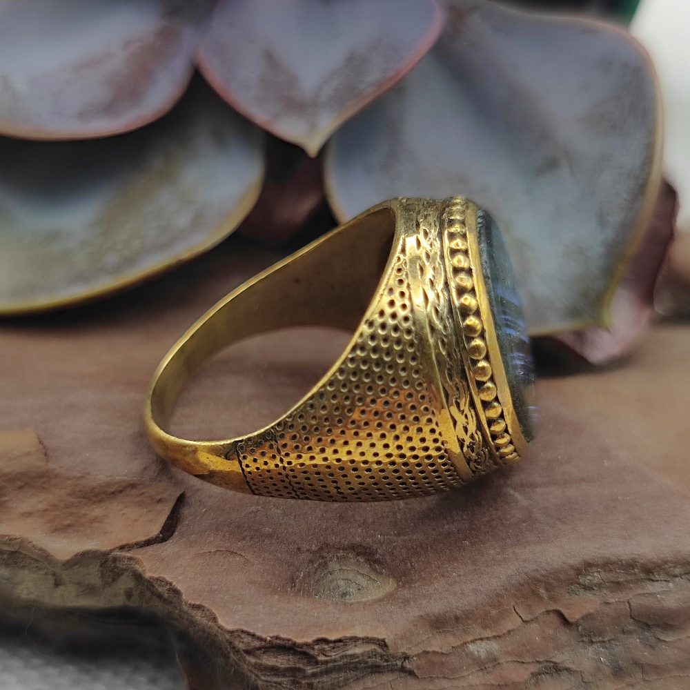 Ogni pietra è unica: le sue venature e i giochi di luce rendono ogni anello un pezzo irripetibile. La combinazione di ottone e labradorite dona equilibrio tra rusticità ed eleganza, trasformando questo accessorio in un compagno ideale sia per la vita quotidiana che per le occasioni speciali.