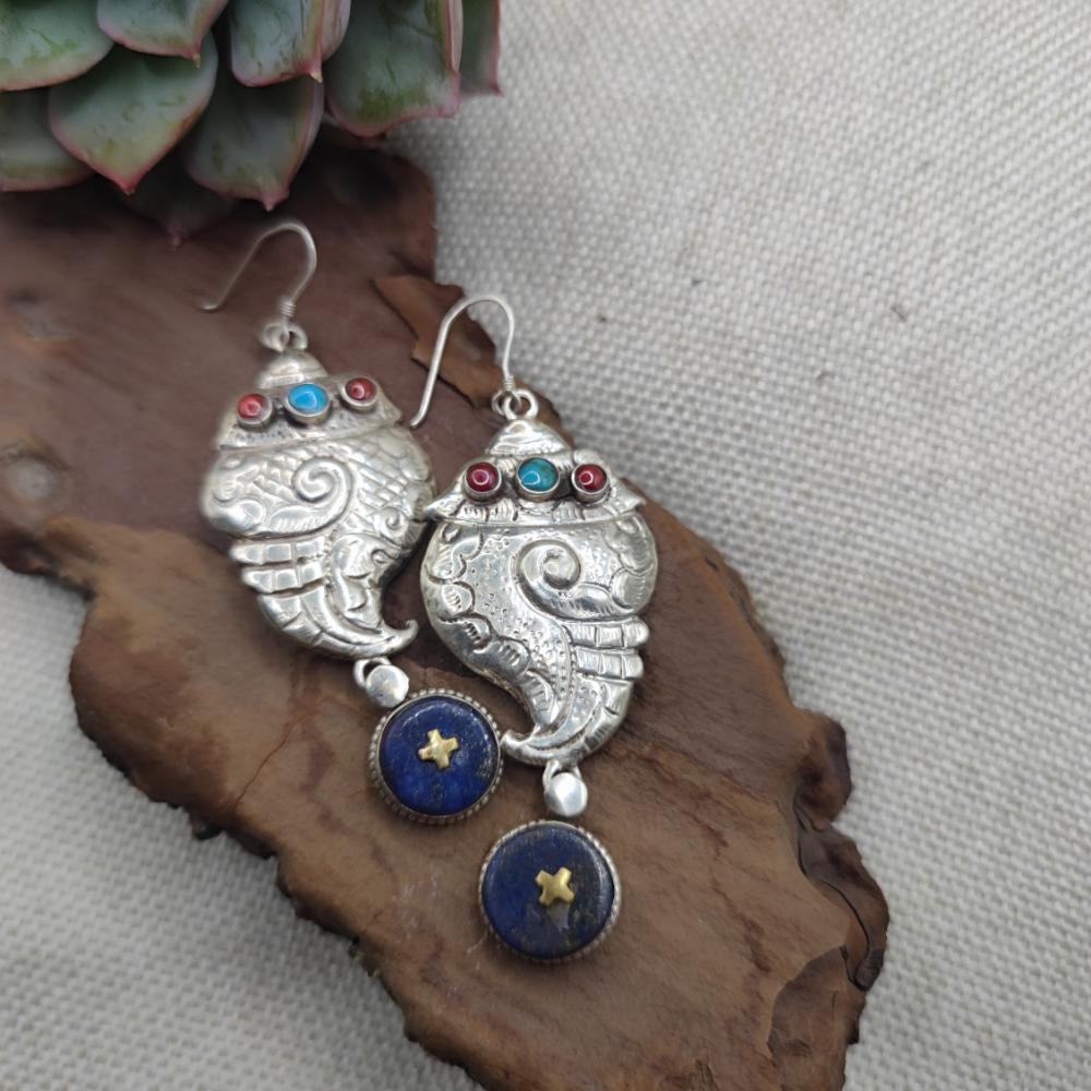 Orecchini tibetani argento 925 lapislazzuli - RIGUTTA. Questi splendidi orecchini etnici tibetani in argento 925 raffigurano la conchiglia sacra, uno degli Otto Simboli di Buon Auspicio del Buddhismo. Emblema di purezza, prosperità e risveglio spirituale, la conchiglia è scolpita con cura e arricchita da dettagli artigianali che ne esaltano il valore simbolico.