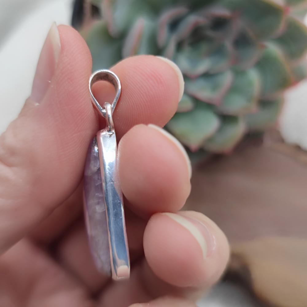Realizzato in argento 925, questo ciondolo offre brillantezza e durata nel tempo grazie alla lavorazione artigianale accurata. La pietra di kunzite è incastonata con precisione per esaltarne la trasparenza e assicurare stabilità, rendendo ogni pezzo un gioiello unico e irripetibile.