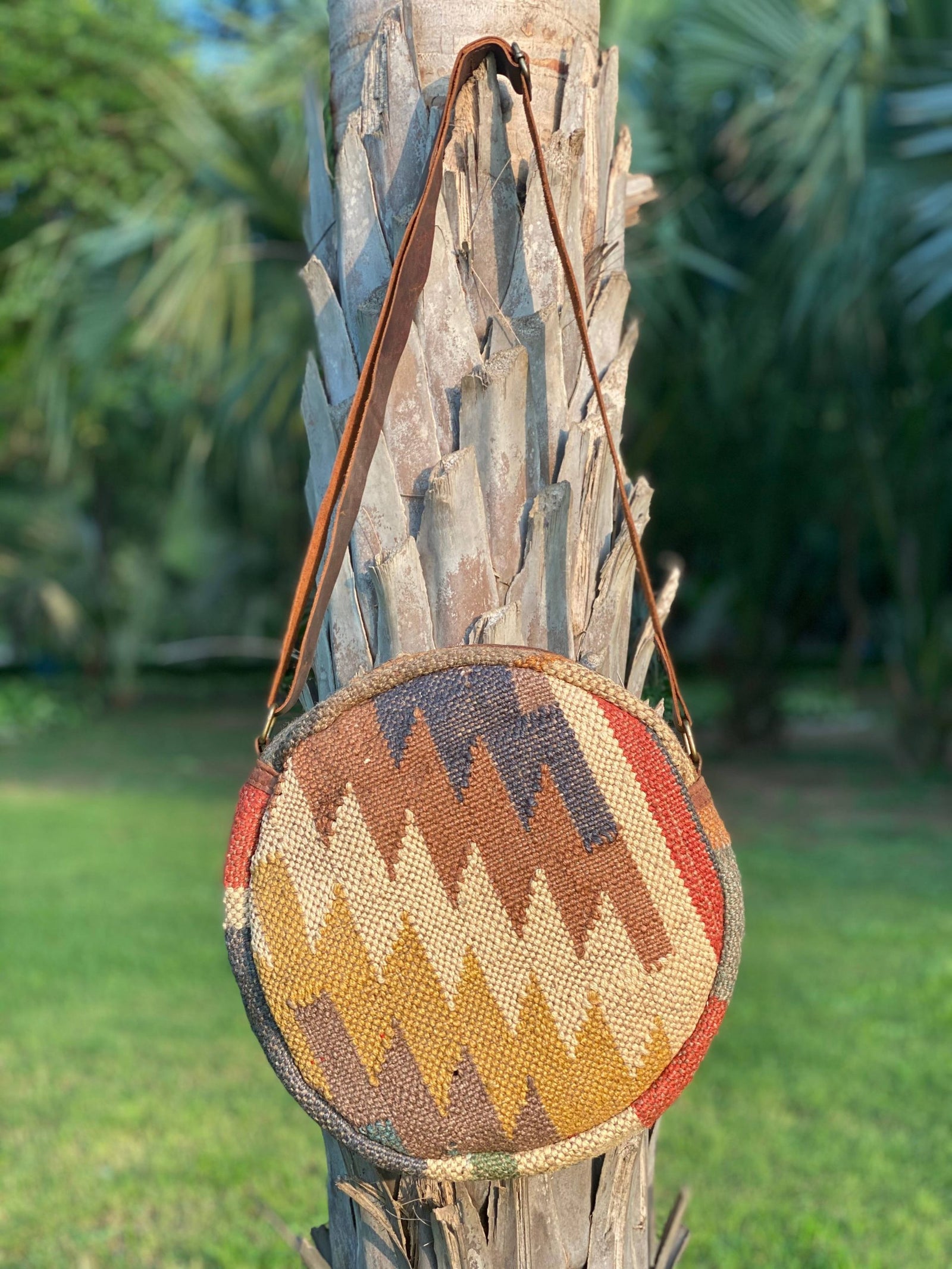 Borsa artigianale realizzata con Kilim e pelle. Questo modello a tracolla è regolabile nella lunghezza. Ogni modello è unico come disegno.